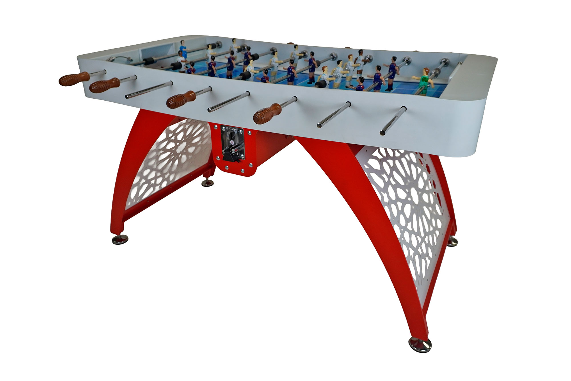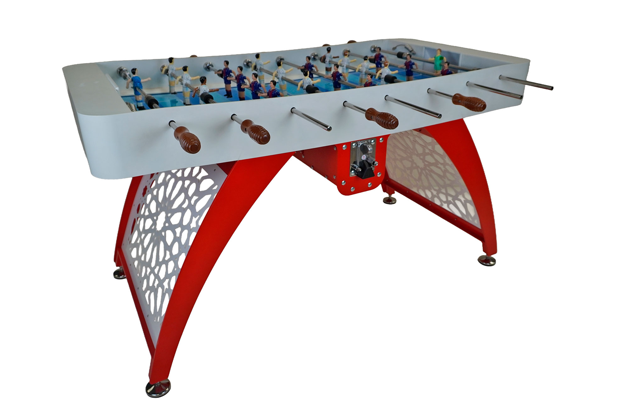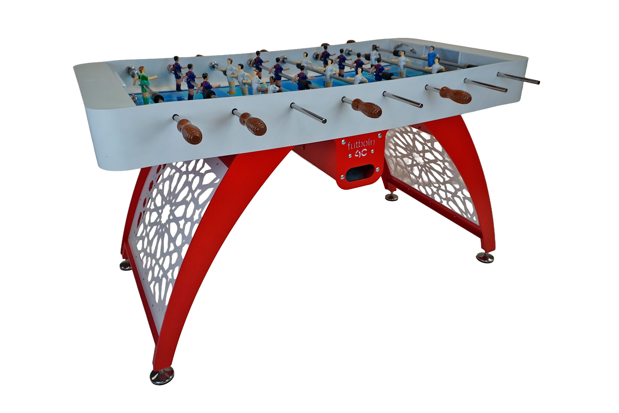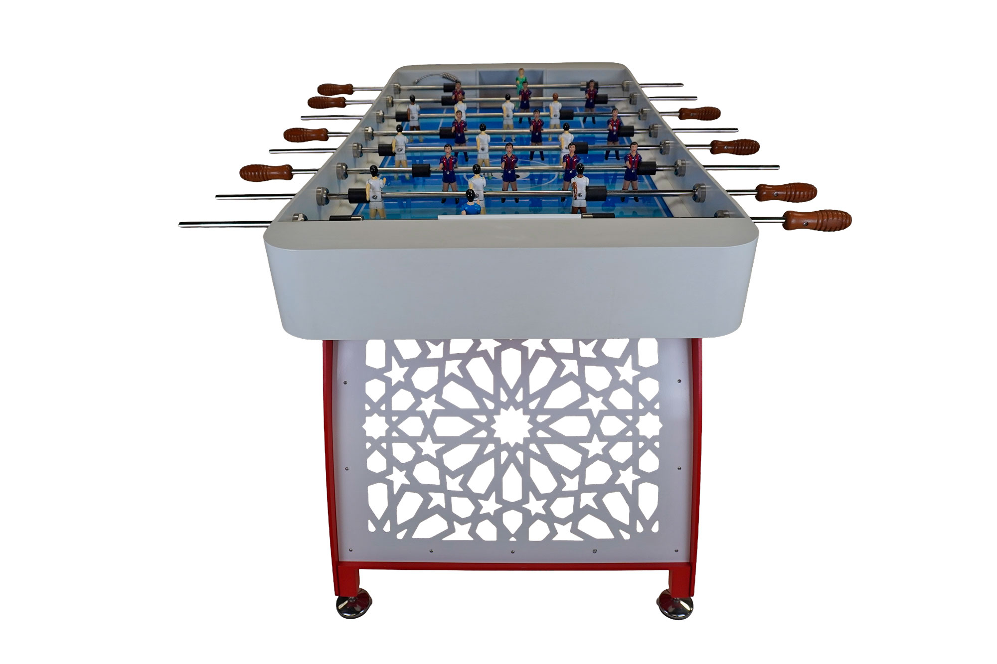 Modelo lacado en blanco y rojo con patas diseño árabe, pista en tonos azules y jugadores con equipaciones clásicas del Real Madrid y F. C. Barcelona. Incluye mangos de iroko natural. Disponible con o sin monedero.