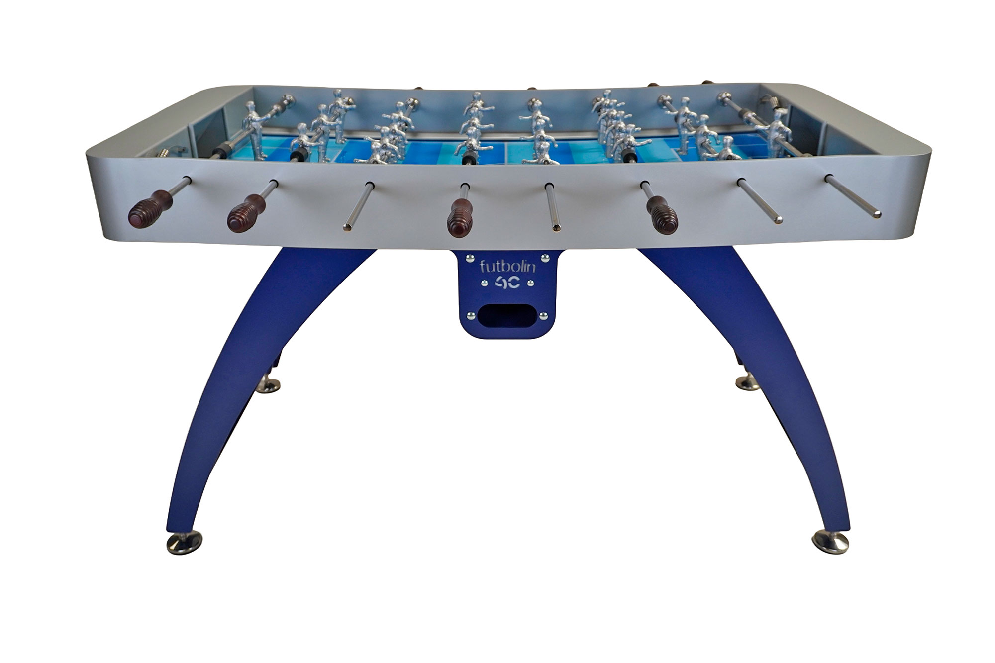 Modelo lacado en plata y azul con patas decorativas efecto balón, pista en tonos azules y jugadores con equipaciones clásicas del Real Madrid y F. C. Barcelona. Incorpora mangos de iroko teñido en color caoba. Disponible con o sin monedero.